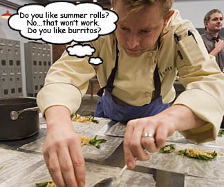 The next morning they have two hours to prepare and pack their foods for delivery to the Chicago Police cadets. During this time, we see the cheftestants complain about their fellow competitors. Antonia, still bitter that she did not win Sam's heart, seems peeved that Dale only cooks Asian food. Andrew points out that Lisa's shrimp is high in cholesterol but she's adamant she's following the rules. Meanwhile, he's chopping parsnips and pine nuts to use as rice in his version of maki rolls. Tom comes through for his regular Sniff 'n' Sneer around the kitchen.